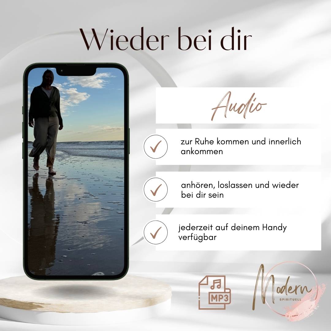 Das Audio Wieder bei dir ist jederzeit auf deinem Handy verfügbar und flexibel einsetzbar. Viele hören es abends zum Abschalten, andere tagsüber zwischen Terminen. Zehn Minuten reichen aus, um innerlich wieder klarer zu werden. Es gibt keinen festen Zeitpunkt und keine richtige Anwendung. Das Audio passt sich deinem Alltag an, nicht umgekehrt. Mit jeder Nutzung wird dir dieser Zustand vertrauter. Innere Ruhe wird wieder abrufbar und Teil deines Erlebens. Das Audio Wieder bei dir begleitet dich leise, zuverlässig und in deinem Tempo. Es erinnert dich daran, dass du jederzeit zu dir zurückkehren kannst.